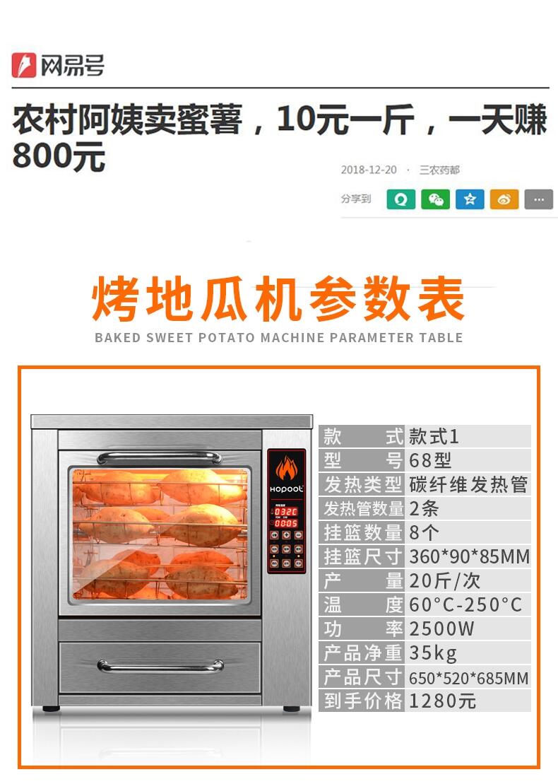 4、安全性能高:最新烤地瓜機在設計時充分考慮了安全因素,采用了多重安全防護措施,有效避免了傳統(tǒng)烤制方式可能帶來的安全隱患。